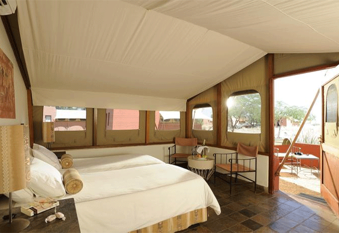 The air-conditioned, tented rooms at Sossusvlei Lodge feature private patios and individual bathrooms stocked with toiletries. Each has a work desk and an electric kettle.